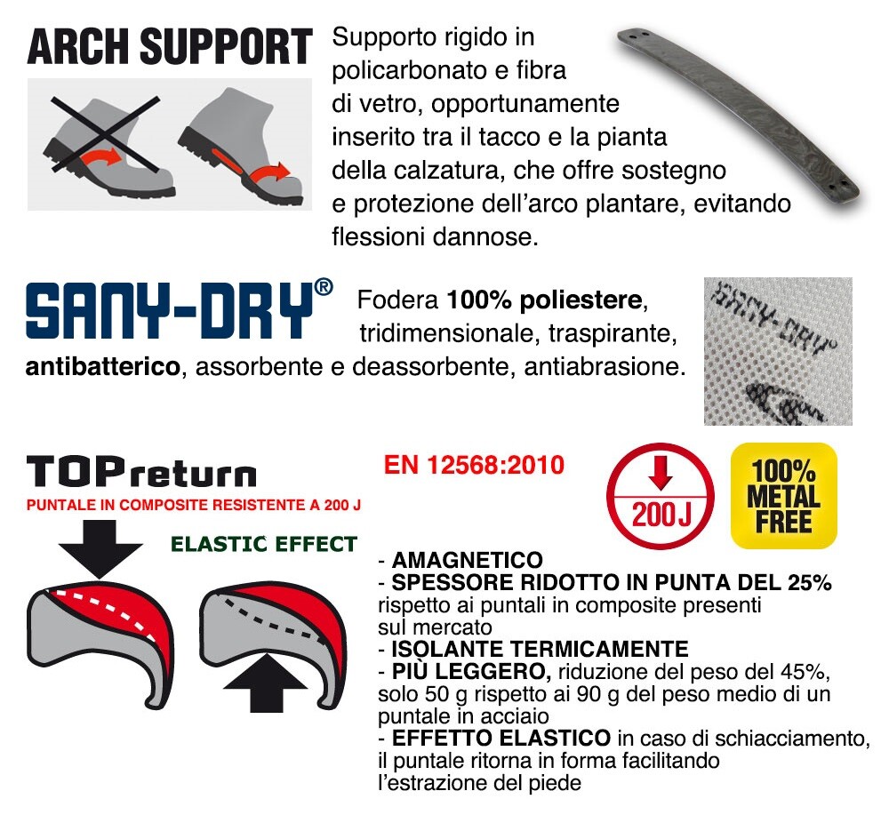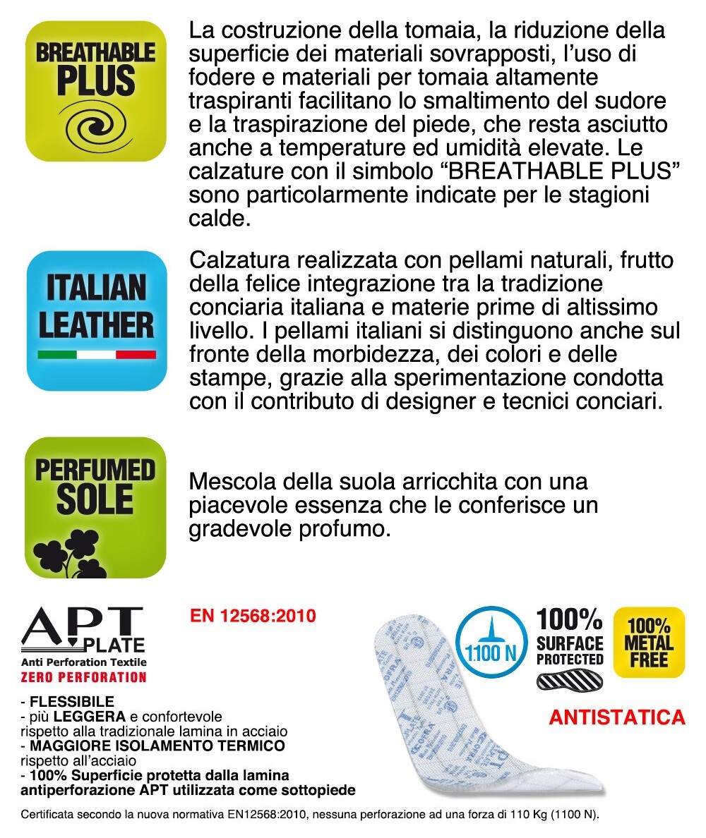 PERFORMANCE - PLUS TECNICI: Italian Leather, Metal Free, protezione della punta